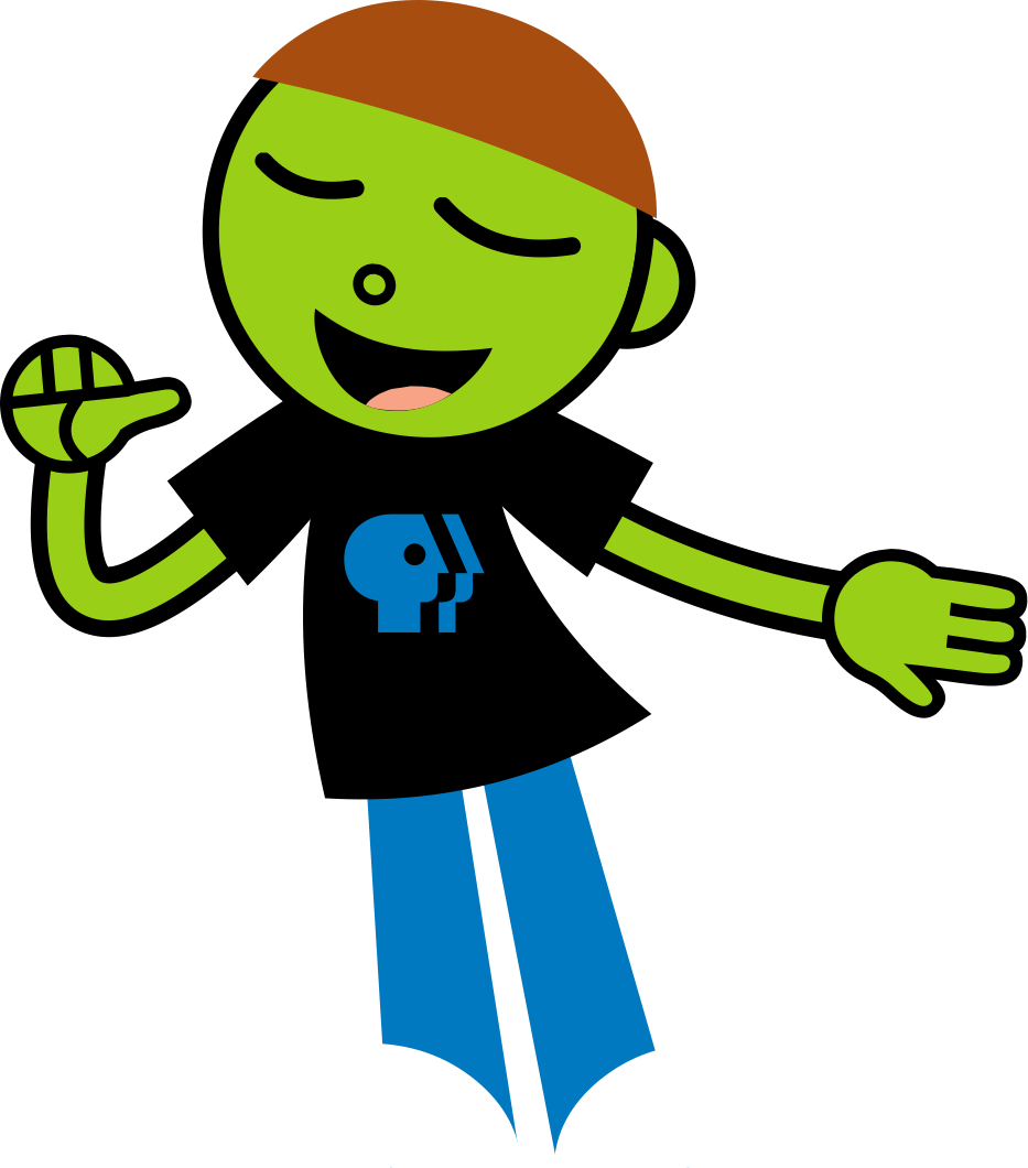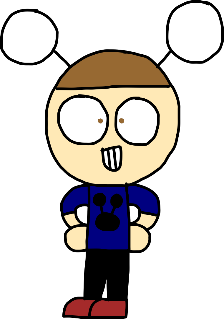 I have brown hair, brown eyes and white skin. I wear two white detachable antennas on my head, a navy blue T-shirt with a black logo printed on it, black pants and red shoes.